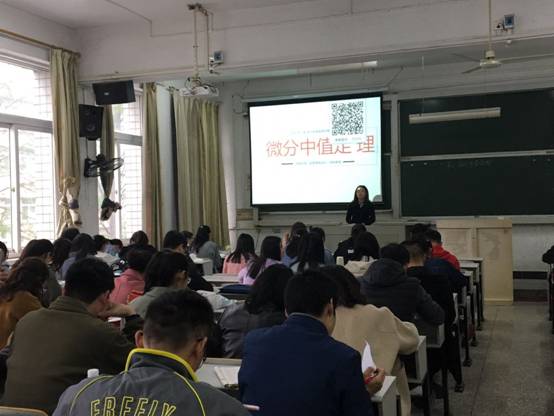 胡倩老师讲授内容为“微分中值定理”(罗尔中值定理、拉格朗日中值定理、柯西中值定理)。参加听课的老师通过扫描二维码加入胡倩老师的“雨课堂”,现场体验员工上台作答、问答互动、现场答题统计、现场答题批改、点评或弹幕到屏幕,有效地展示了“雨课堂”良好的师生课堂互动、及时的授课反馈等特点,让老师们亲身体验了手机进课堂、信息技术辅助实现教与学的新的教学形态。
