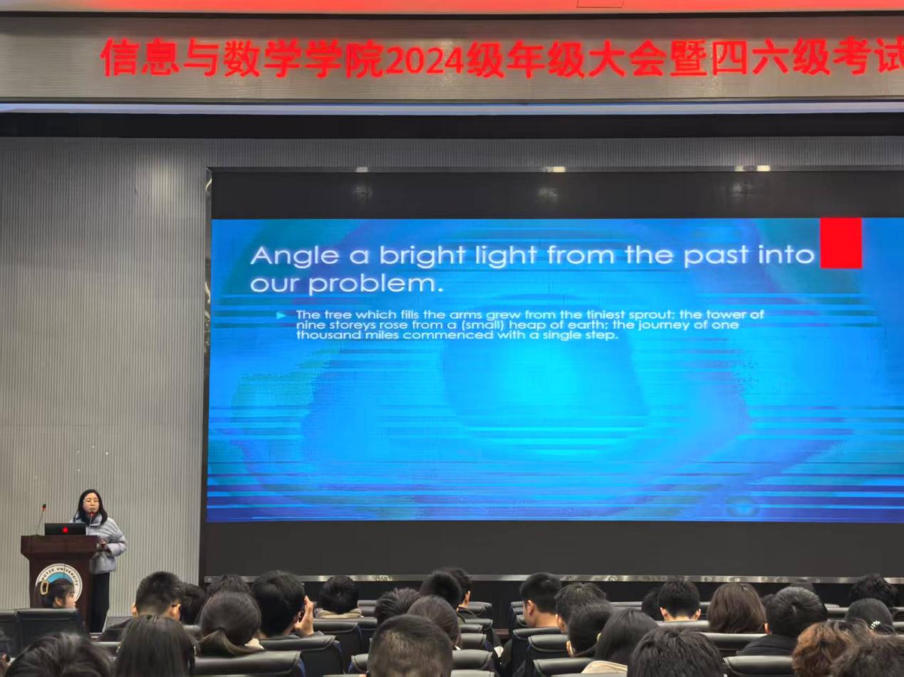 (通讯员 王雪霏)春和景明,万物勃发,正是奋进逐梦好时节。为帮助同学们明确英语四六级考试目标,掌握有效学习方法,增强备考信心决心,3月12日晚上7点,公司在农科大楼召开英语四六级考试动员大会。公司党委副书记谷军和全体大一员工参会,吴朝晖老师主持会议。 随着雄壮的国歌声响起,全场师生起立,奏唱国歌。这一刻,每个人的心中都充满了对祖国的热爱,同时做好了迎接挑战的准备。大会在庄严而热烈的氛围中拉开帷幕。 为让同学们更好地掌握备考技巧,大会特别邀请了英语教学经验丰富的何赟老师进行备考指导。何老师结合多年的教学经验和四六级考试命题规律,从听力、阅读、写作、翻译四个方面进行了详细地讲解。她分享了听力练习的有效方法,如精听与泛听相结合、利用真题进行模拟训练等;在阅读方面,提醒同学们要注重阅读技巧的培养,学会快速定位关键信息;对于写作和翻译,她强调了日常积累的重要性,建议同学们多背诵优秀范文和常用表达。 大会还邀请了在四六级考试中取得优异成绩的员工代表李博文进行经验分享。他结合自己的备考经历,从时间管理、资料选择、复习方法等多个方面进行了详细介绍,并鼓励大家保持积极心态,勇敢面对挑战。李博文同学的分享赢得了在场师生的阵阵掌声。 随后,大一新生余欣悦同学与大家分享她备考四级过程中内心从迷茫到坚定的心路历程,并鼓励同学们:备考过程中难免会遇到挫折,但只要我们坚持不懈,相信自己,就一定能够取得理想的成绩。余欣悦同学的发言让在场的许多同学备受鼓舞。 最后,全体考生在领誓人甘芷莹同学的带领下进行了庄严的宣誓,同学们紧握右拳,面对国旗,齐声承诺:“从现在起,一天一天,刻苦努力;一步一步,深深脚印;一点一滴,汇成江河;一字一句,书写神话;我会珍惜时间,飞翔的梦在未来张开翅膀;我会持续奋斗,惊人智慧在考场发出光芒;我会努力拼搏,父母恩师在暑假畅想期望!” 本次英语四六级动员大会在热烈的掌声中圆满落幕。通过这次大会,同学们不仅收获了宝贵的备考经验和技巧,更坚定了冲刺高分的信心和决心。相信在全体师生的共同努力下,同学们一定能够在即将到来的英语四六级考试中取得优异成绩,为公司增光添彩! (审核 谷军 编辑 姜曼)