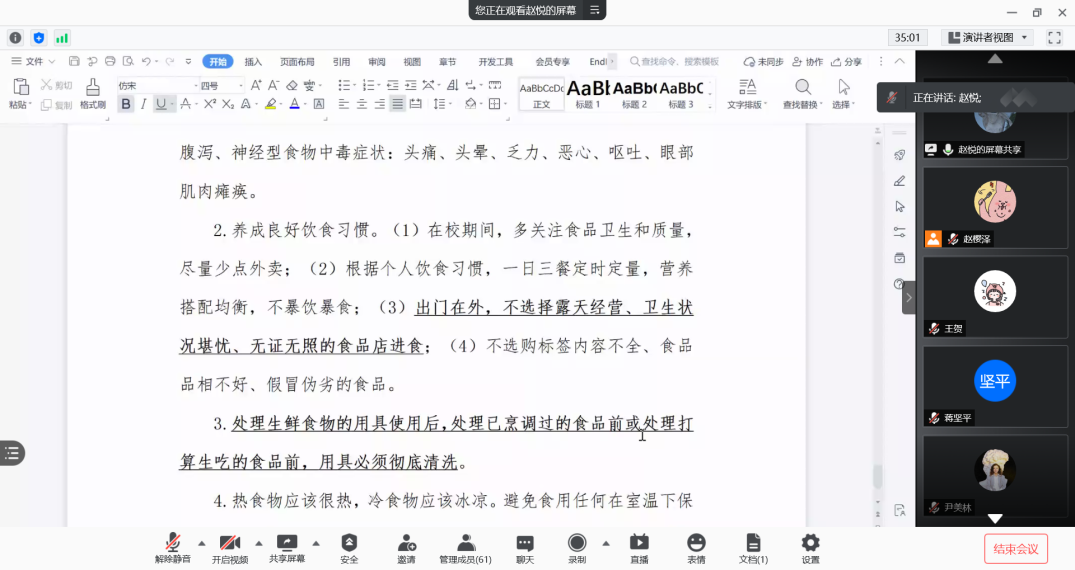 随后,赵悦带领大家学习了有关防火防盗、饮食安全等方面的知识,并强调了有关五一假期出行的安全问题,呼吁大家出行时要采取常态化疫情防控举措,带好口罩,无事尽量不聚集。