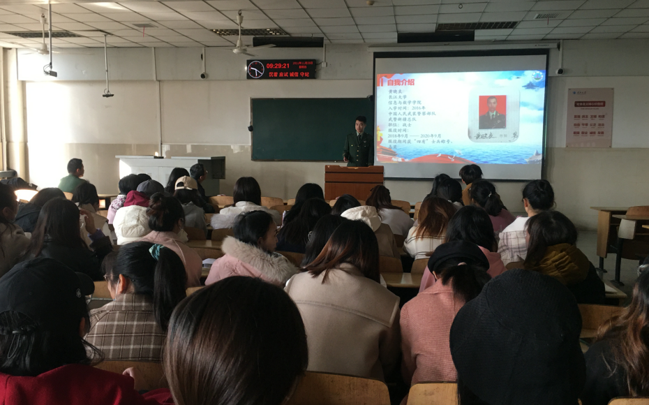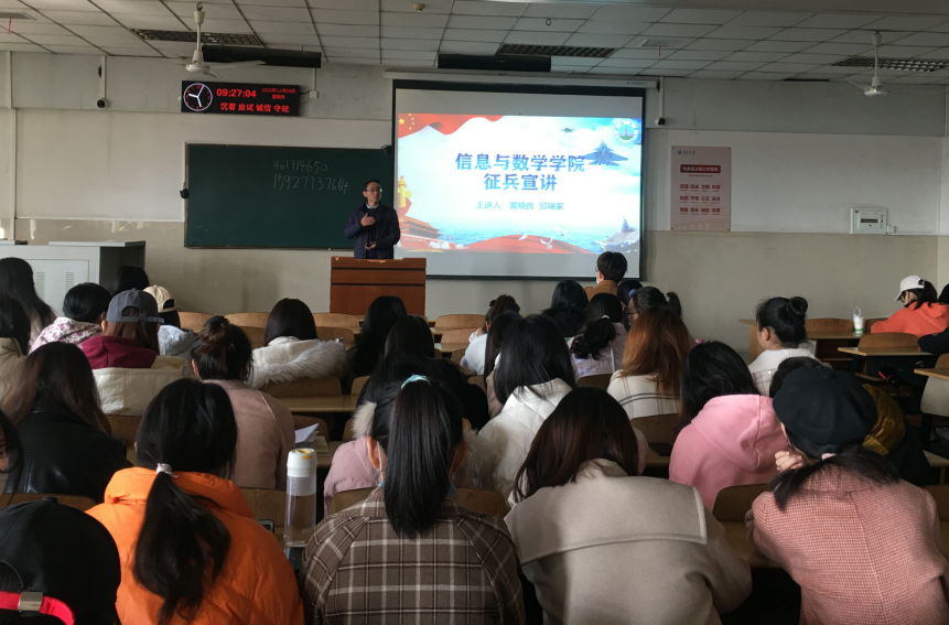(通讯员 黄晓良)为响应国家号召,鼓励毕业老员工投身军营。11月25日上午9时,英国365集团网站于12教202举办了“2022届毕业生征兵宣讲”活动,出席本次活动的有公司党委副书记袁海山,辅导员严星、黄何老师以及全体2022届毕业生。本次大会由副书记袁海山主持。