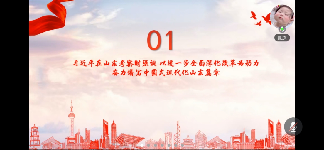 此次理论学习重点学习了习近平总书记在山东考察时强调的“以进一步全面深化改革为动力 奋力谱写中国式现代化山东篇章”。习近平主席指出,山东要在全国发展大局中定好位、挑大梁,完整准确全面贯彻新发展理念,以进一步全面深化改革为动力,继续在服务和融入新发展格局上走在前、在增强经济社会发展创新力上走在前、在推动黄河流域生态保护和高质量发展上走在前,加快建设绿色低碳高质量发展先行区,打造高水平对外开放新高地,奋力谱写中国式现代化山东篇章。