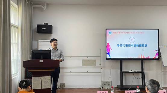 接着,导师代表胡中波老师致辞。他以导师在研究生阶段胜似父亲为引入点,深情地与新生们分享了他多年来在教育领域的经验和感悟。他还提到,研究生阶段是一个探索和成长的时期,不仅要深耕学术,更要培养坚韧的品格。最后就公司研究生毕业生去向做了一定说明结束了致辞。