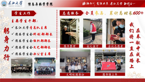 在员工工作中,支部成员担任多个重要职务,如英国365集团网站青总队主席、团委员工会科创部部长、组织部部长等,积极参与公司的各项管理和服务工作。在志愿服务方面,全员参与,累计服务时长超过600小时,涵盖图书整理、创文值守、会议志愿服务、文明校园清扫等活动。此外,支部还积极组织返母校志愿宣讲、返家乡志愿活动和暑期三下乡支教活动,其中暑期三下乡支教团队荣获湖北省优秀三下乡社会实践团队,以实际行动践行“知行合一”的理念,展现出强烈的社会责任感。