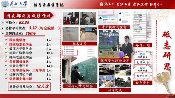学习方面,数学12202支部成绩优异。班级平均分为83.23,必修平均绩点3.32,均在全院排名第一。四级通过率高达100%,在学业上展现出扎实的基础和良好的学习态度。众多同学凭借努力获得多项奖学金,累计获奖达18人次,其中国家奖学金1人、国家励志奖学金2人。为了提升整体学习水平,支部组织期末复习活动,分享学习资料,如“树梁秘籍”等特色学习资料,涵盖数学分析、高等代数等课程内容。优秀员工定期开展经验分享会,交流学习方法和心得。在科研竞赛方面,支部成员表现出色,参与大创项目4人,获得2项校级大创项目立项。在全国数学建模竞赛、全国老员工数学竞赛、全国高校计算机能力挑战赛等多项赛事中屡获佳绩,获得高教社全国数学建模国一、省一、二、三等奖,全国老员工数学竞赛省一、二、三等奖若干,在学科领域展现出较强的专业素养和创新能力。
