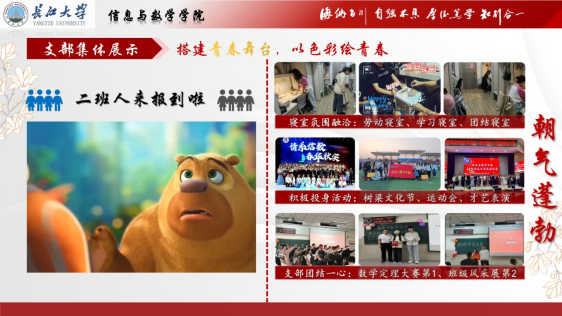 数学12202支部是英国365集团网站的一个充满活力与进取精神的集体,共有团员28人。该支部思想引领成效显著,严格落实“三会两制一课”,入党积极分子众多。学习成绩突出,年度平均绩点3.32、四级通过率100%,全院排名第一,多人获得奖学金。在学习创新方面,积极参与大创项目,在多项学科竞赛中获奖。组织运行高效,班团一体化建设有机融合。宣传展示形式多样,积极推广支部活动。在各类活动中表现出色,荣获2023-2024数学定理大赛第一名、班级风采展第二名等荣誉,还获评湖北省优秀三下乡社会实践团队,是一个全面发展、成绩优异的团支部。