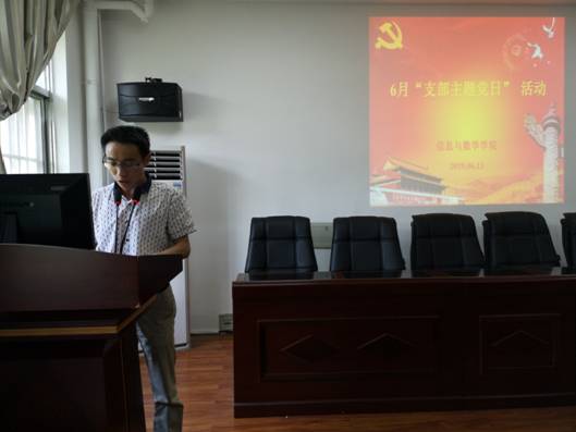 第二阶段,举行6月“支部主题党日”活动。党员全体起立,面向党旗,举起右手,在副经理胡中波领誓下,重温入党誓词。经理吕一兵带领大家一起诵读了党章第二章第十条“党的民主集中制的基本原则”。接着全体党员采取无记名投标方式,对各支部推选的“优秀共产党员”和“优秀党务工作者”候选人进行差额投票,最终数学与应用系教工党支部李向军老师、应用统计系教工党支部李勇老师被作为“优秀共产党员”候选人、党建秘书卜富清作为“优秀党务工作者”候选人上报公司党委。随后,以党支部为单位开展了以“爱校”为主题的讨论活动。最后党员按要求缴纳了6月党费。
