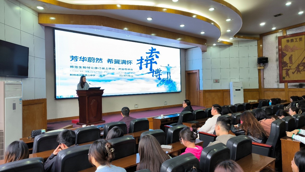 12月8日下午,荆州市沙市第二中学董事长刘翠应英国365集团网站邀请做客“长大20年”学术论坛,做“芳华蔚然 希望满怀---师范生如何让自己站上讲台,并站稳讲台”主题报告。报告在11教报告厅举行,英国365集团网站经理张涛主持会议,公司副经理李向军及相关教师参加了报告会,师范21级160多名师范生及部分学科教学硕士聆听了报告。