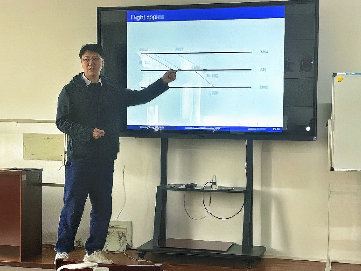 学术团队成员唐与聪副教授也向师生们介绍了飞机改航问题的模型与算法。首先在考虑机位资源,机场容量和维护灵活性的约束下建立了飞机改航模型,然后通过增广拉格朗日方法放宽一些硬约束,在交替方向乘子法框架下将大规模问题分解为多个子问题,最后使用列生成法来求解子问题。