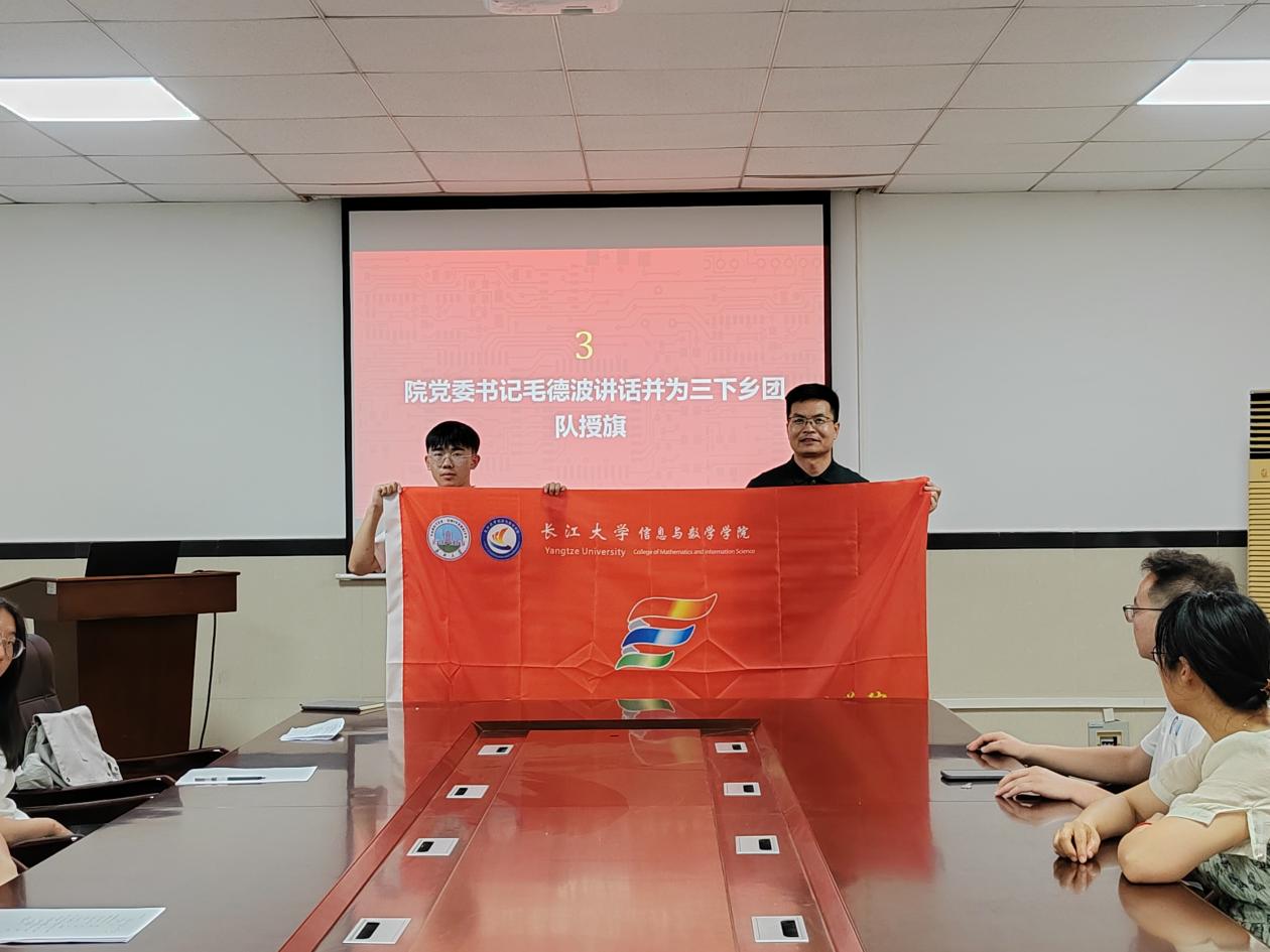 公司党委书记毛德波发表讲话。他深刻阐述了暑期社会实践的重要意义,鼓励同学们将专业知识与实践相结合,在服务社会的过程中传播先进文化,不断提升综合素养。讲话结束后,毛德波书记亲自为“三下乡”团队授旗,鲜艳的旗帜在会场中格外醒目,象征着沉甸甸的责任与光荣的使命,接过旗帜的瞬间,队员们心中的使命感油然而生。