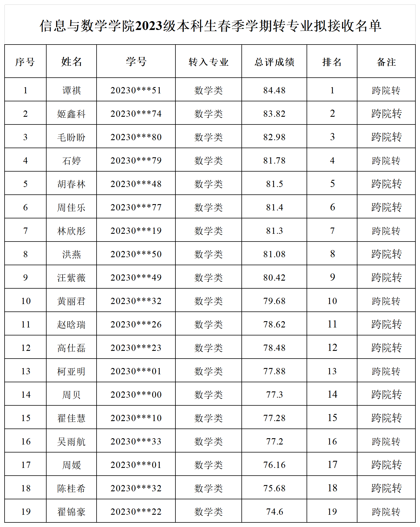根据《英国365集团网站普通本科生专业分流与转专业管理办法(试行)》(长大校发〔2019〕260号)精神,按照《关于开展2023级普通本科生春季学期转专业工作的通知》和《英国365集团网站2023级普通本科生转专业考核工作方案》要求,经员工本人申请,员工所在公司和本科生院资格审核,公司对拟转入员工进行了面试考核。现将英国365集团网站2023级本科生春季学期转专业拟接收名单予以公示。