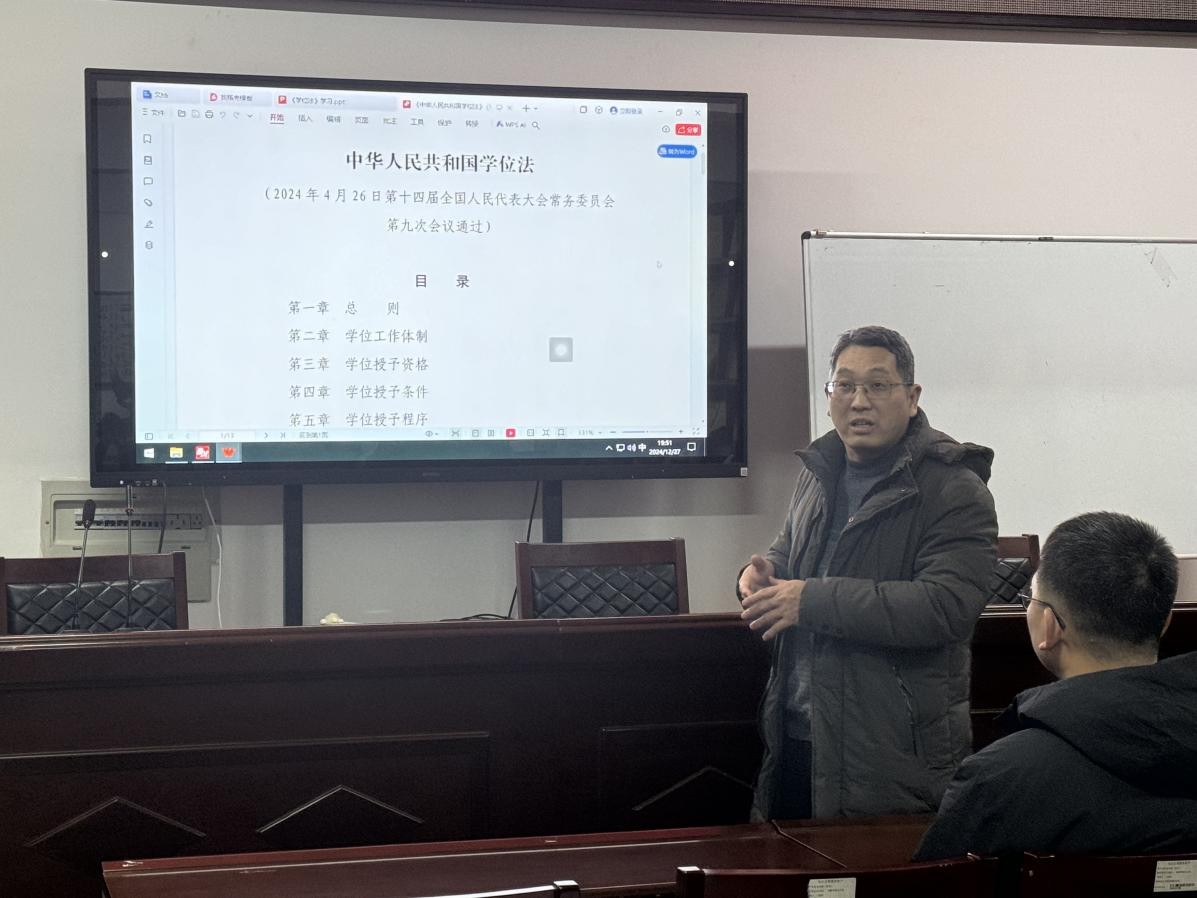 会上,李经理对《学位法》进行了全面解读,阐述了《学位法》的新变化、新要求和新趋势。特别指出,随着《学位法》的实施,学位授予工作将面临新的挑战,必须学习把握其精神实质、全面贯彻落实到位,以确保学位授予工作的公正性、权威性和规范性。并对公司硕士学位授予流程、标准及要求等进行了说明。