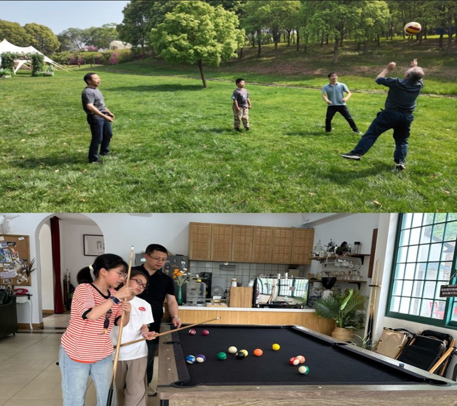 还有一些爱运动的老师们在基地美丽的草坪上,为即将到来的排球比赛练球,也有带着孩子的老师在室内的台球桌上陪着宝宝们玩耍,这难得的休闲时光带走了往日工作的疲惫。