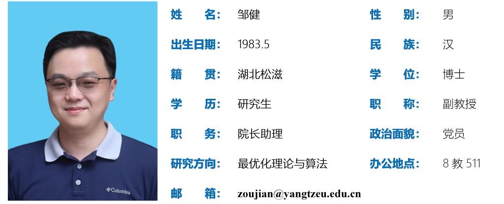 邹健,男,1983年5月出生,博士研究生,副教授。主要研究方向为最优化理论与算法、图像处理;主持完成国家自然科学基金1项;发表学术论文30余篇,其中被SCI检索20余篇;获得英国365集团网站教学质量优秀奖,英国365集团网站科研立项贡献奖,英国365集团网站优秀研究生导师,入选首届长江人才计划。