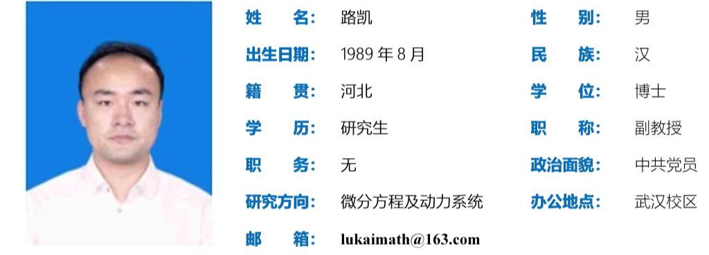 路凯,男,生于1989年8月,博士,副教授,主要研究方向为微分方程及动力系统。2019年12月毕业于华南理工大学数学公司;获批国家自科基金青年项目1项、参与合作面上项目1项。在国际著名期刊Chaos、Journal of Mathematical Analysis and Applications 、Nonlinear Dynamics 等发表多篇SCI学术论文。